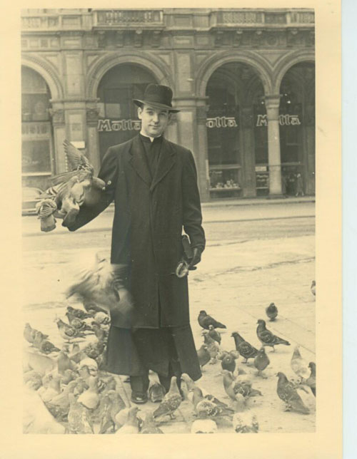 Based on the architecture of the building in the background, along with post cards having the same structure, it is believed this picture was taken on the grounds of the Duomo (Cathedral) in Milan. |